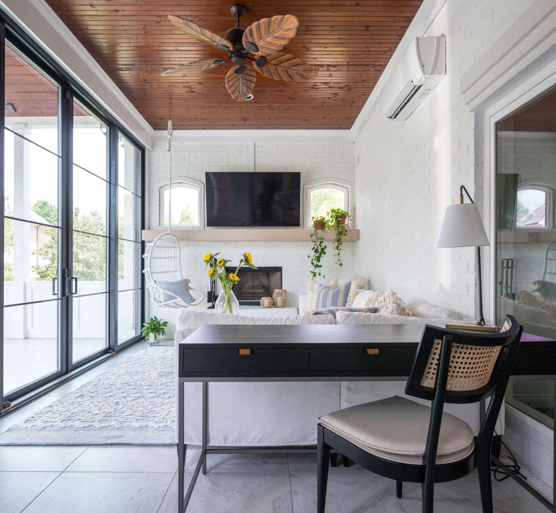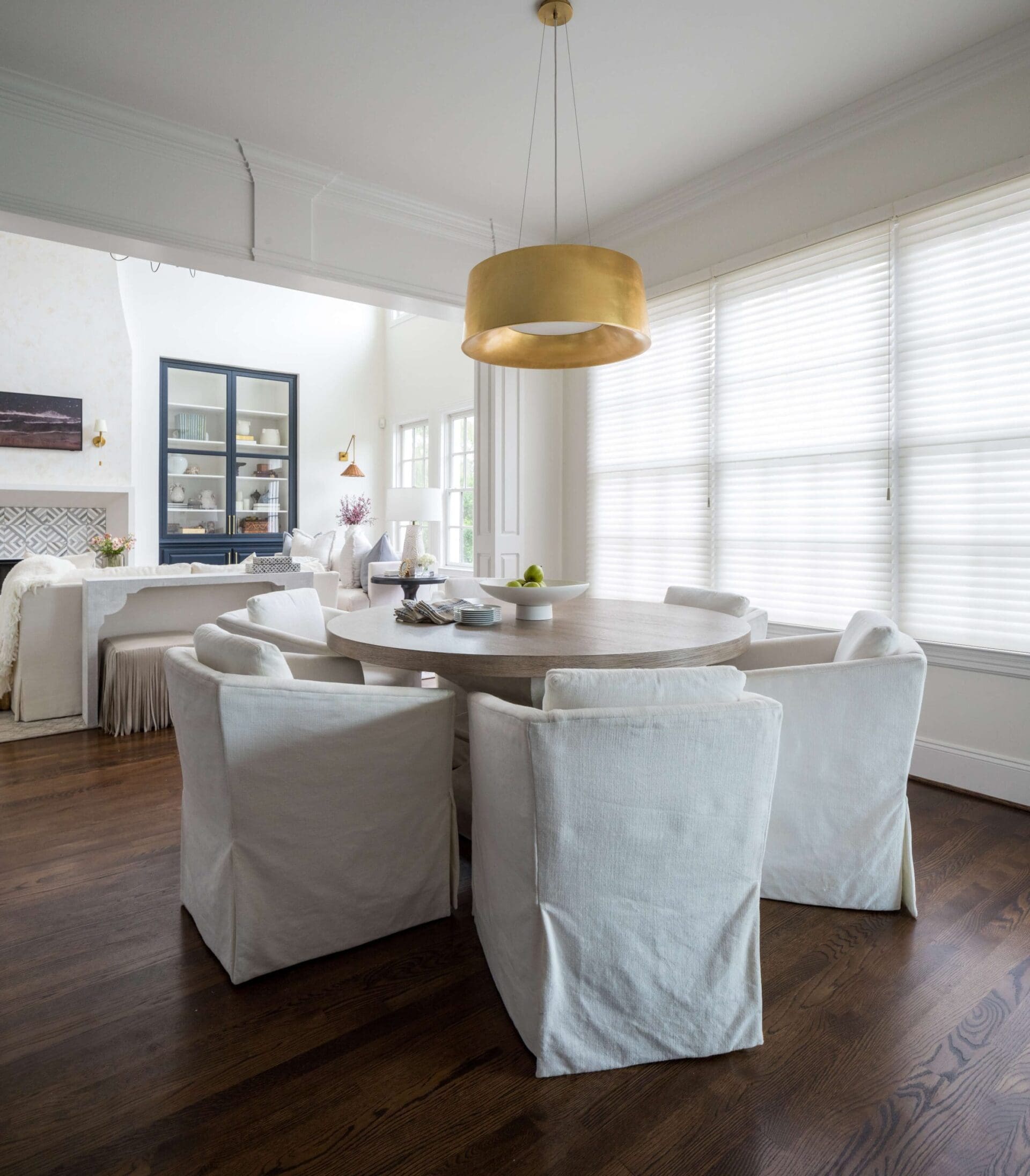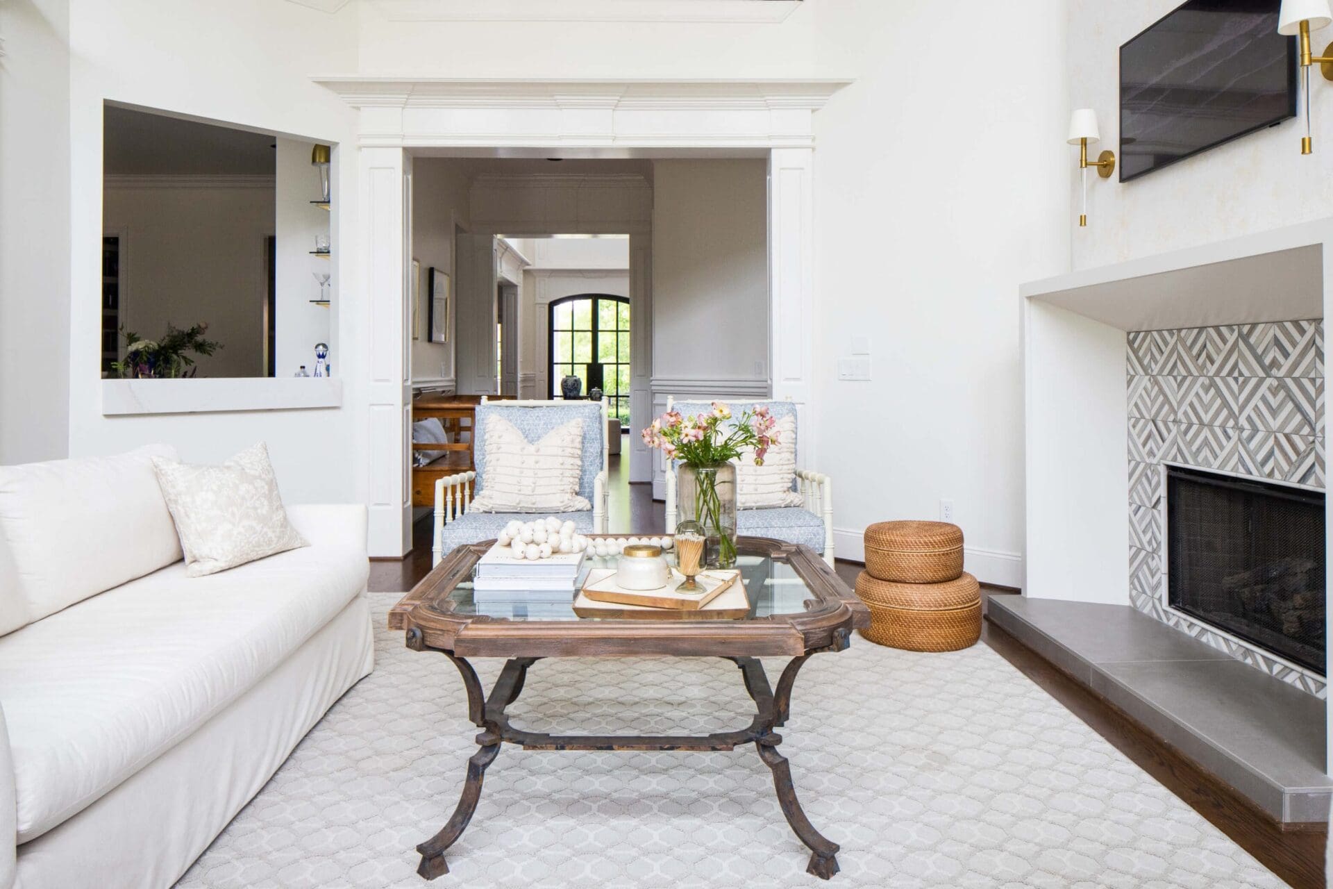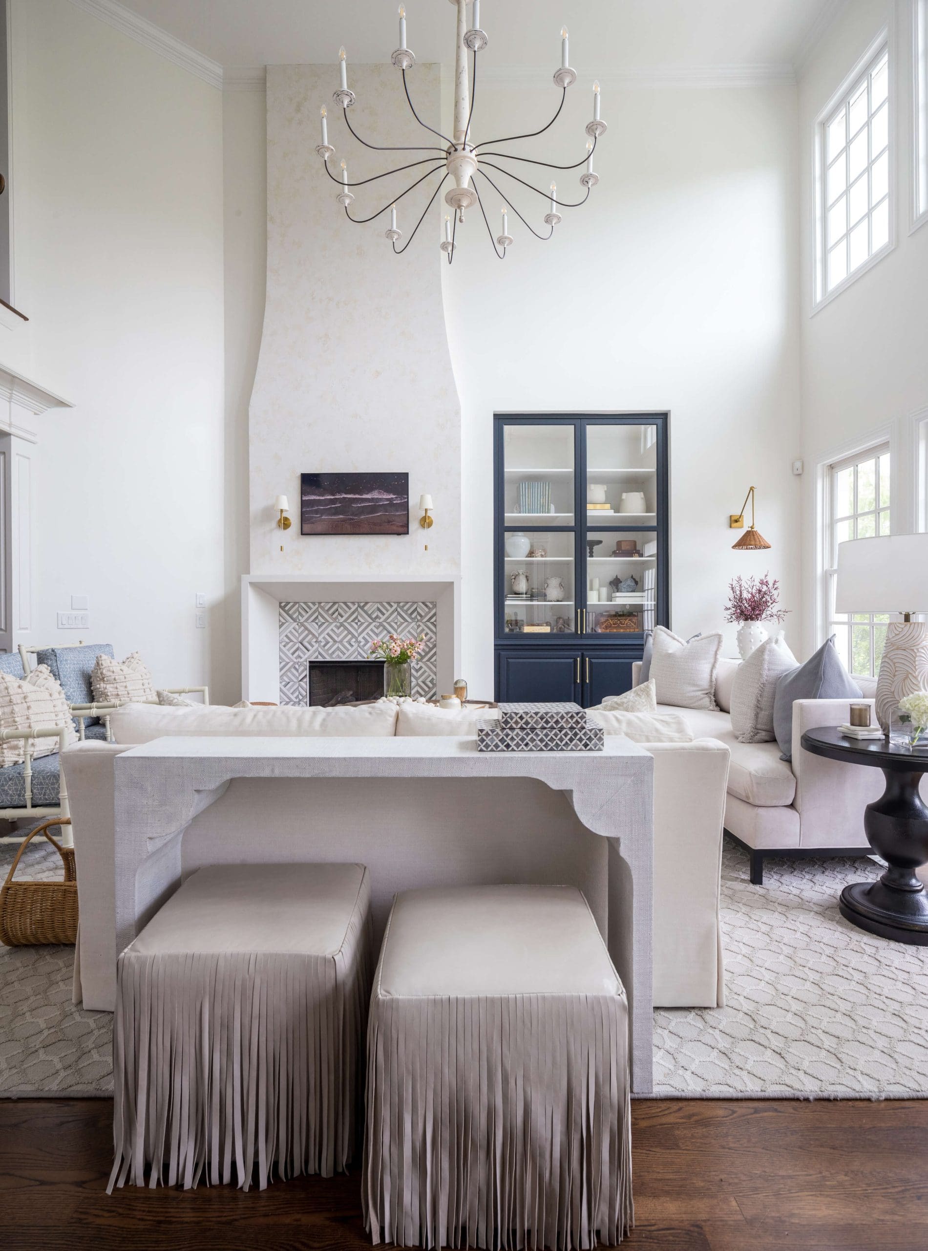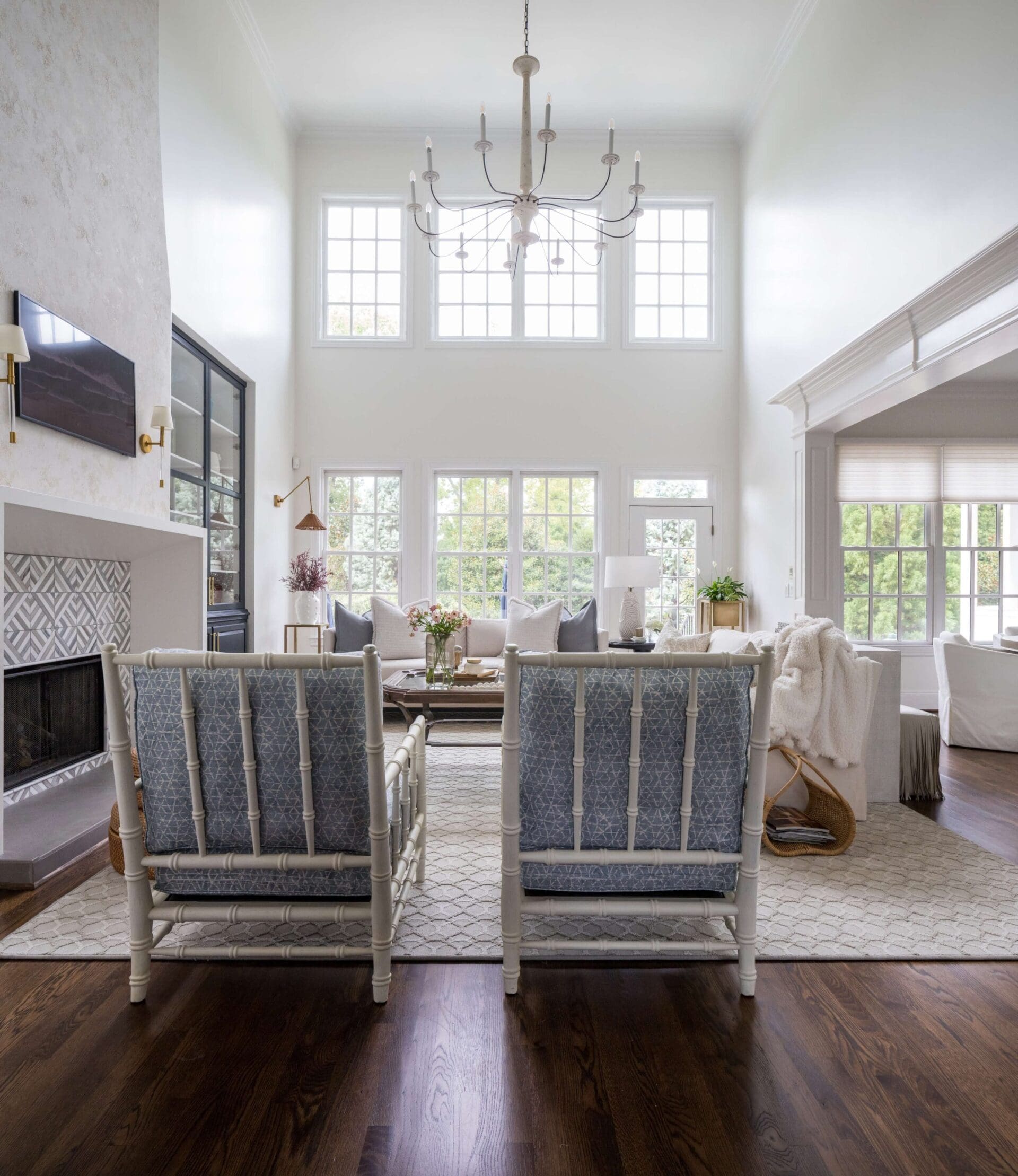 The renovation of the Annondale home showcases a remarkable dedication to revitalizing its core areas. The kitchen boasts custom cabinets, sleek countertops, and premium appliances, marrying functionality with elegance seamlessly. Within the expansive great room, a bespoke built-in cabinet featuring large glass doors serves as a striking centerpiece, harmonizing with the modern fireplaces comprehensive facelift. The fireplace's new modern surround and elegant curved flu exude refined charm, accentuated by the addition of iron front doors. Additionally, the luxurious porch addition extends the living space outdoors, providing an inviting retreat for relaxation and social gatherings.