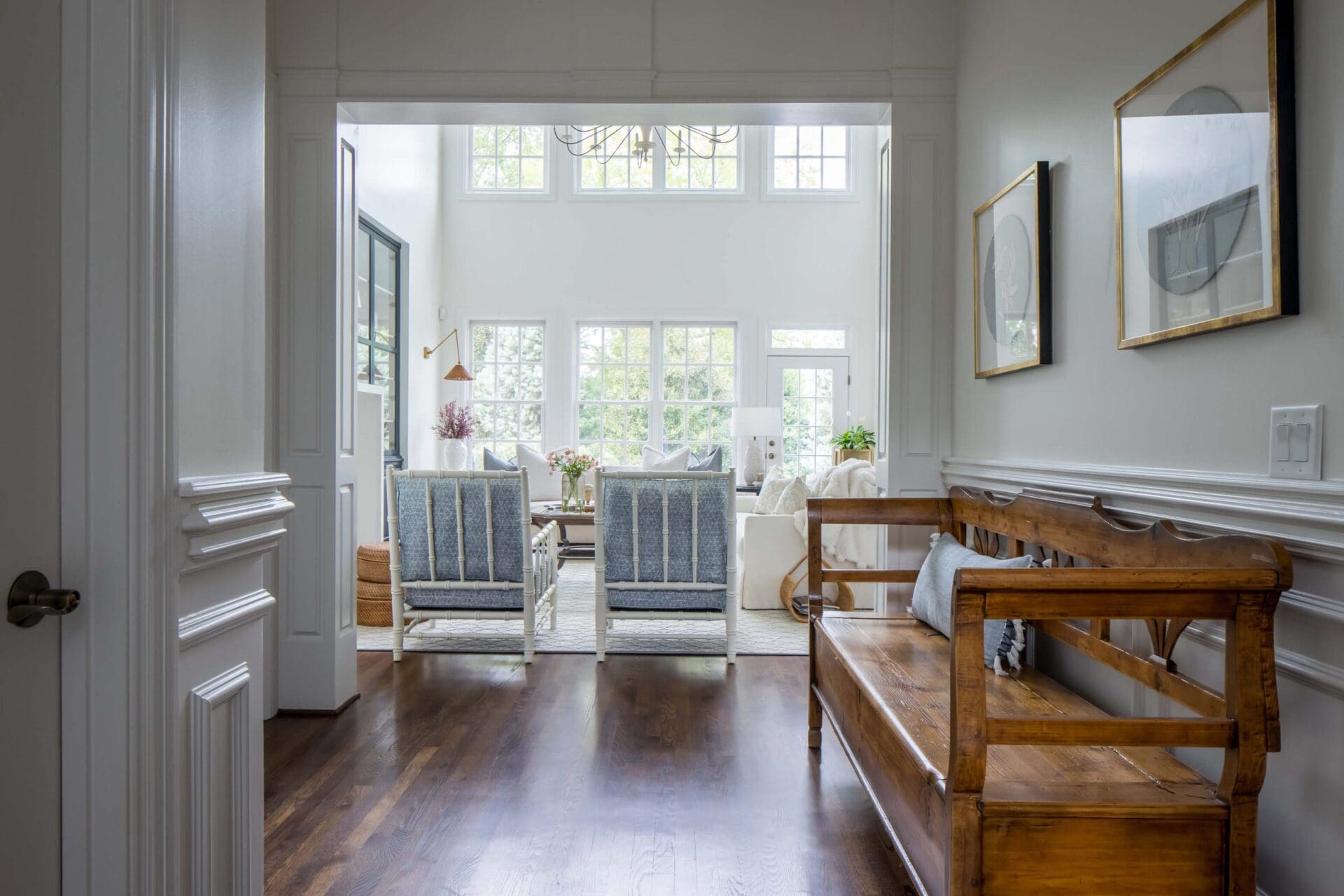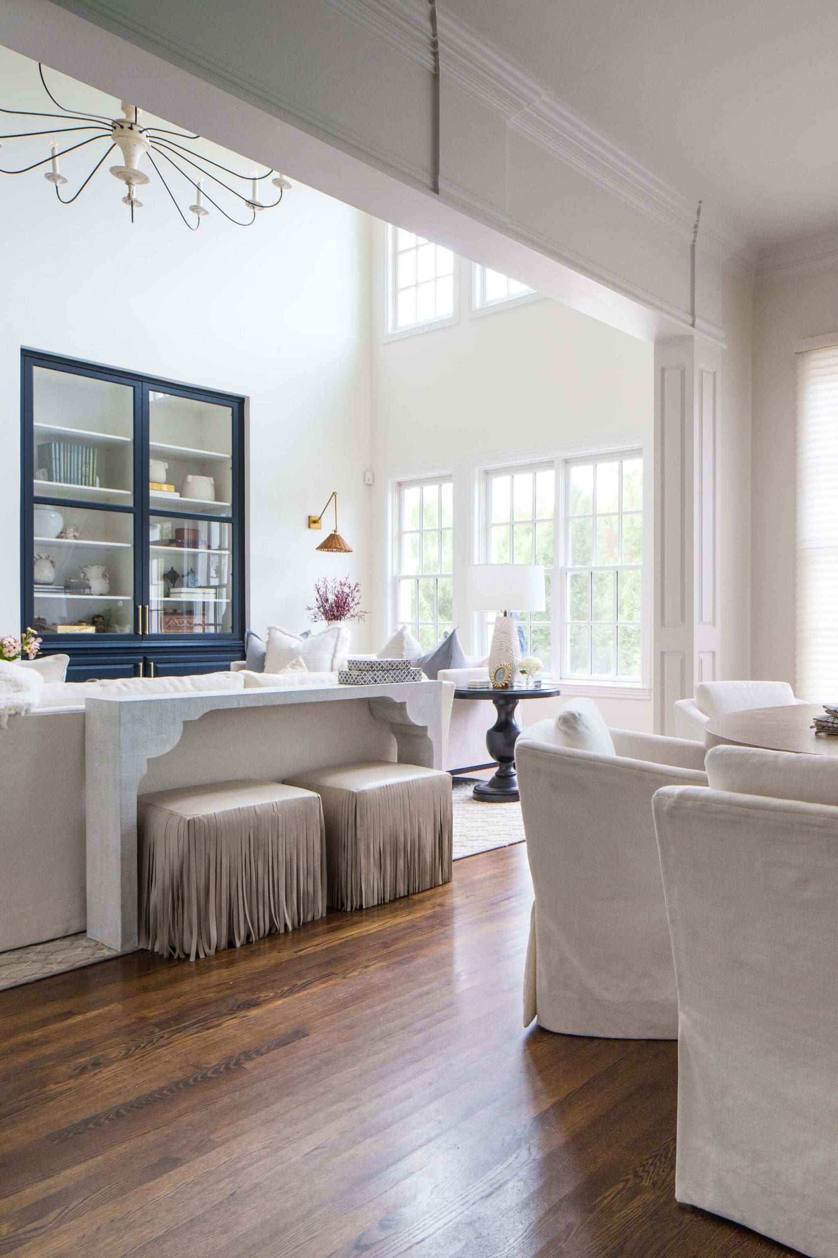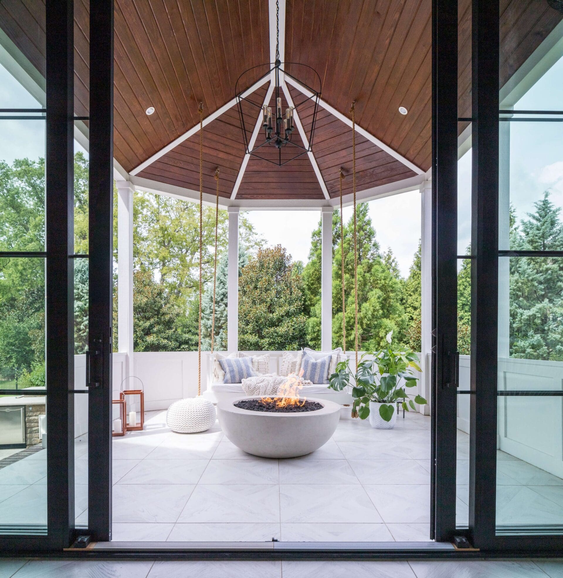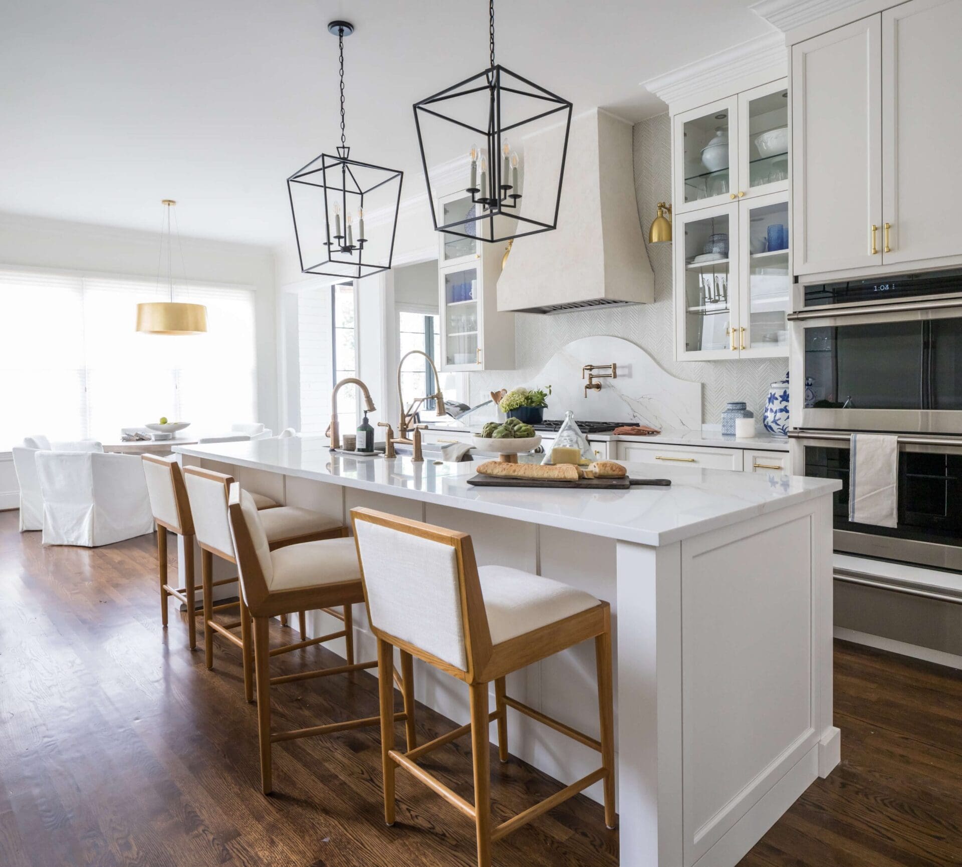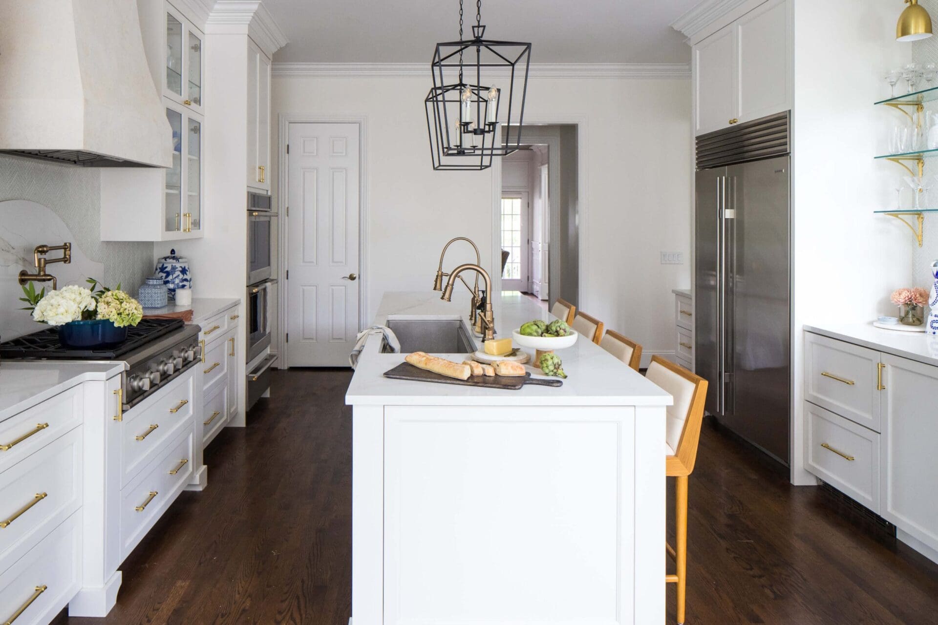 The renovation of the Annondale home showcases a remarkable dedication to revitalizing its core areas. The kitchen boasts custom cabinets, sleek countertops, and premium appliances, marrying functionality with elegance seamlessly. Within the expansive great room, a bespoke built-in cabinet featuring large glass doors serves as a striking centerpiece, harmonizing with the modern fireplaces comprehensive facelift. The fireplace's new modern surround and elegant curved flu exude refined charm, accentuated by the addition of iron front doors. Additionally, the luxurious porch addition extends the living space outdoors, providing an inviting retreat for relaxation and social gatherings.
