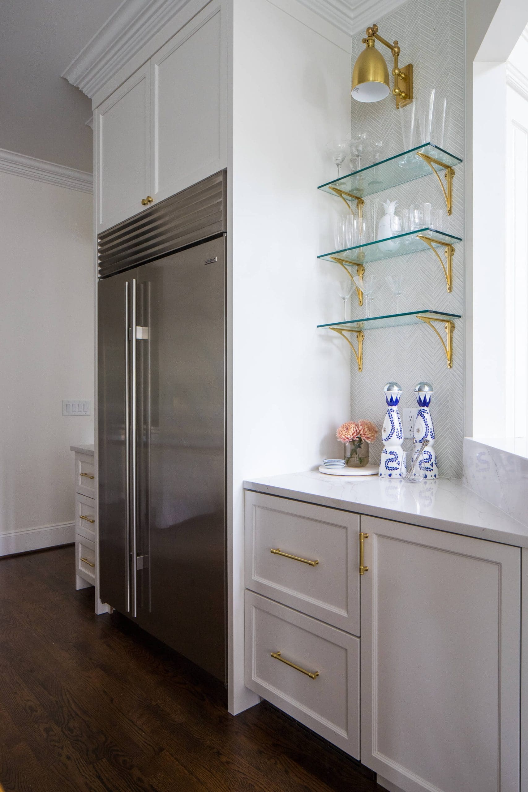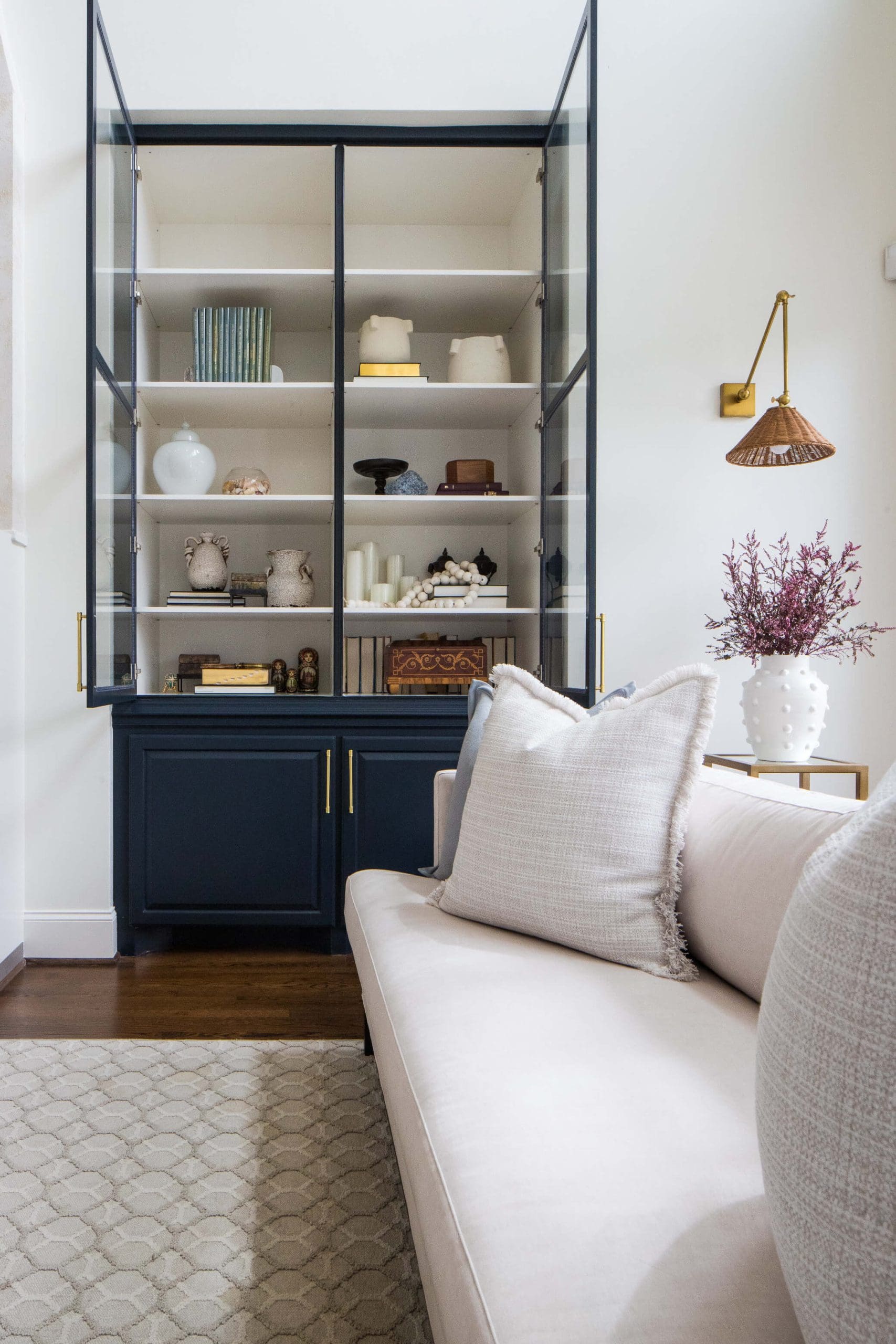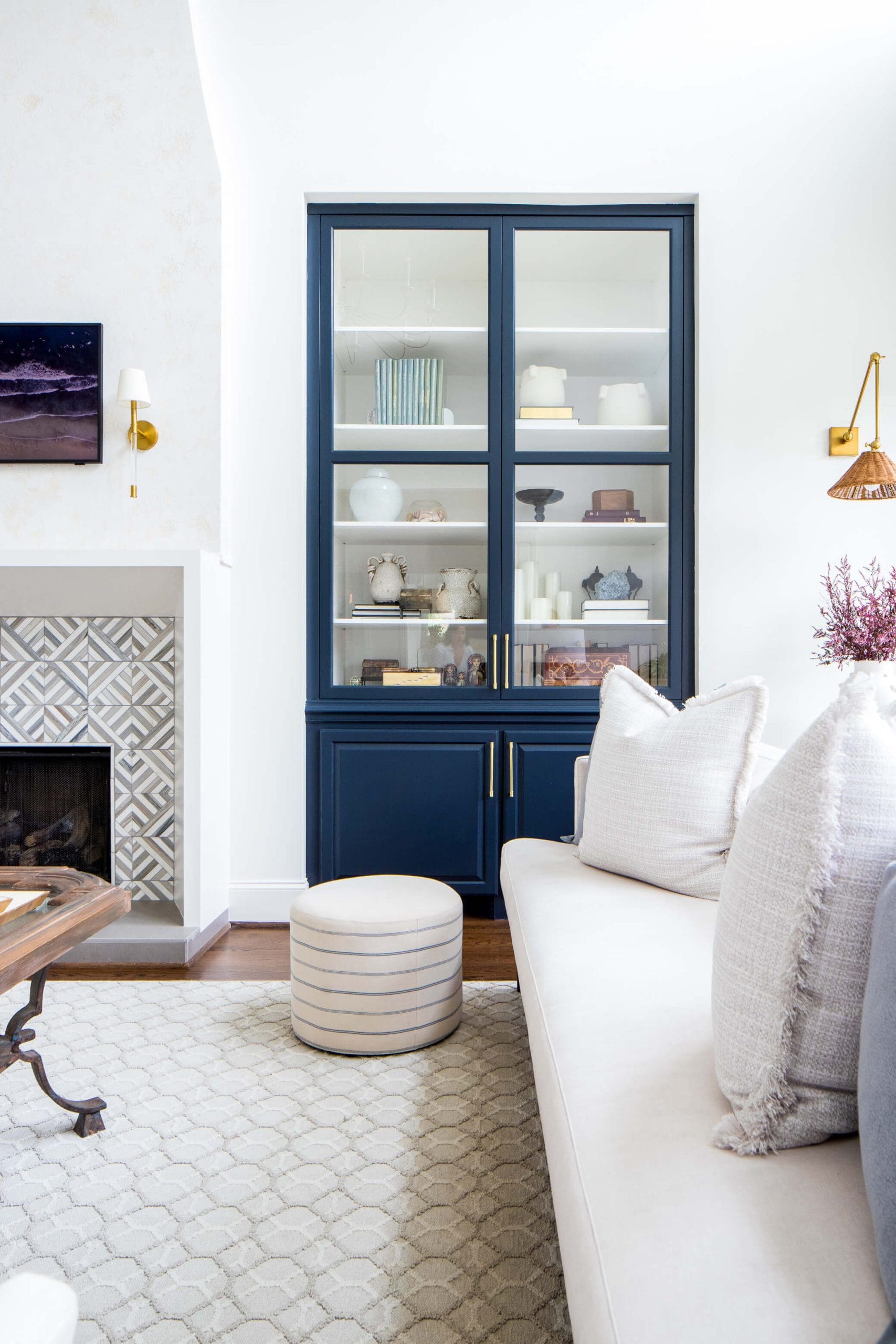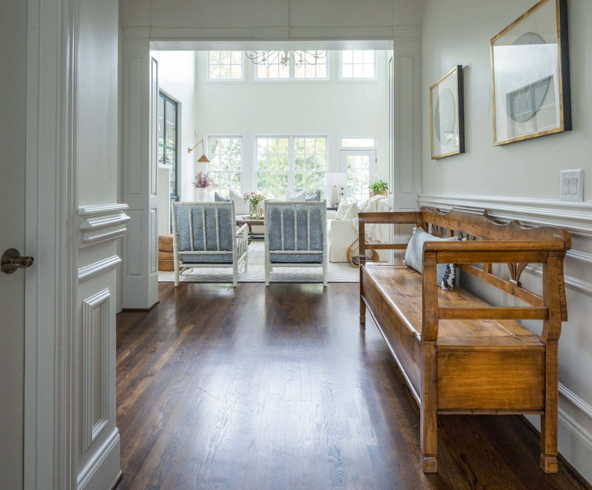 The renovation of the Annondale home showcases a remarkable dedication to revitalizing its core areas. The kitchen boasts custom cabinets, sleek countertops, and premium appliances, marrying functionality with elegance seamlessly. Within the expansive great room, a bespoke built-in cabinet featuring large glass doors serves as a striking centerpiece, harmonizing with the modern fireplaces comprehensive facelift. The fireplace's new modern surround and elegant curved flu exude refined charm, accentuated by the addition of iron front doors. Additionally, the luxurious porch addition extends the living space outdoors, providing an inviting retreat for relaxation and social gatherings.
